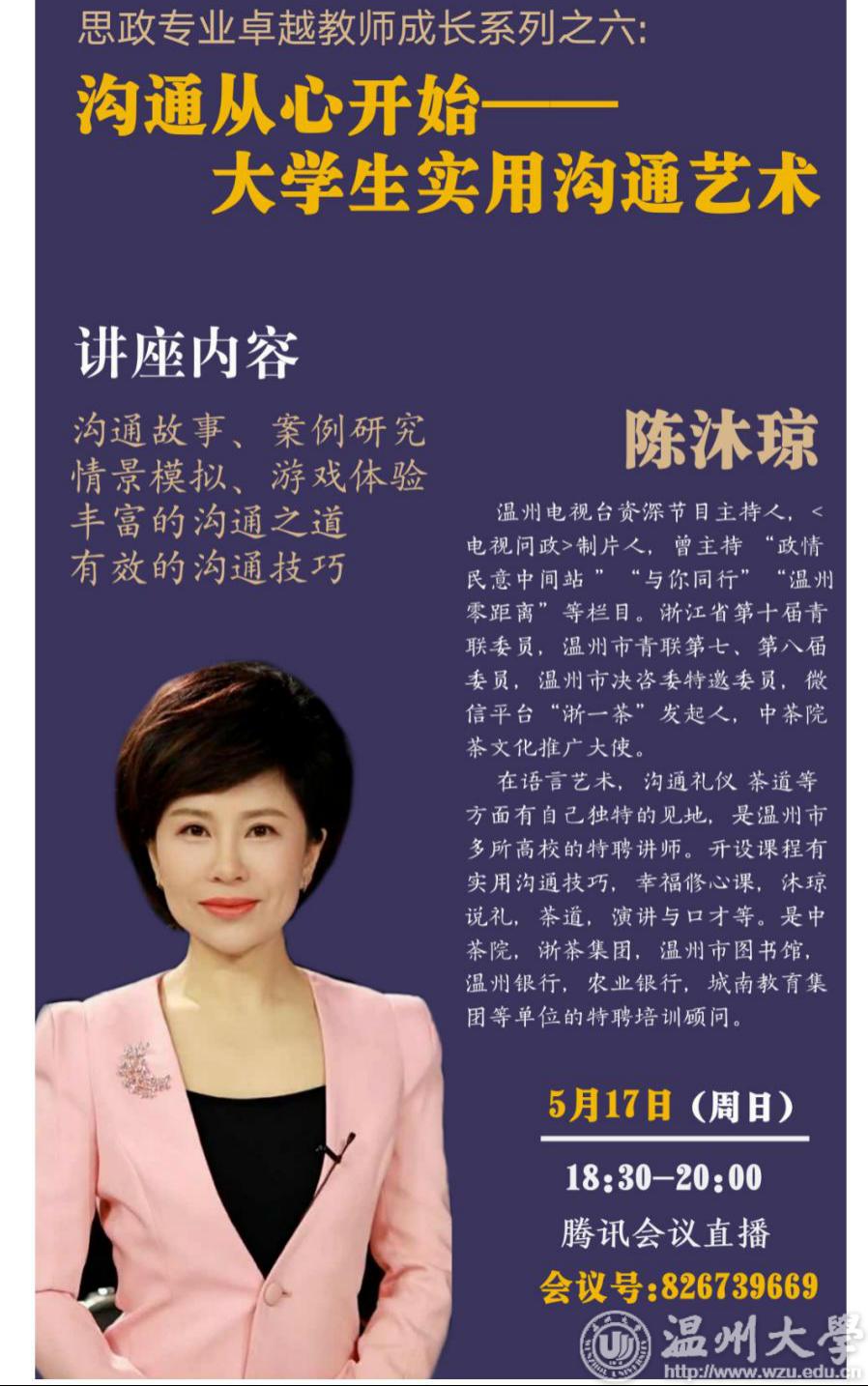 习近平总书记在2019年教师节就“如何成为好老师”,传达了殷切寄语。习近平总书记说:“做好老师,要有理想信念,要有道德情操、要有扎实学识、要有仁爱之心。”成人网站 始终秉持培训新一代优秀教师的初心,认真学习贯彻党的精神,积极回应习近平总书记的殷切希望,开展“思政专业卓越教师成长系列课程”。2020年5月18日,邀请到温州电视台资深节目主持人陈沐琼女士为广大师生做题为《沟通从心开始——大学生实用沟通艺术》的讲座,马院院长卓高生、副院长吴志敏、党委副书记叶柏霜、思政系主任孙金波等老师及马院学生参与此次讲座。
